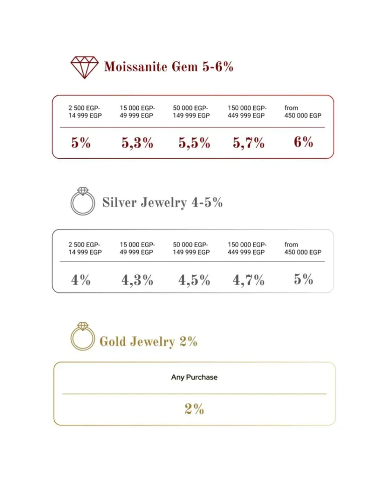 • في جميع الحالات، تبقى المجوهرات هي المنتج الأساسي، وبرنامج MoneyBack مجرد ميزة إضافية مرتبطة بالشراء وليست بديلاً عن أي منتج مالي أو بنكي أو استثماري